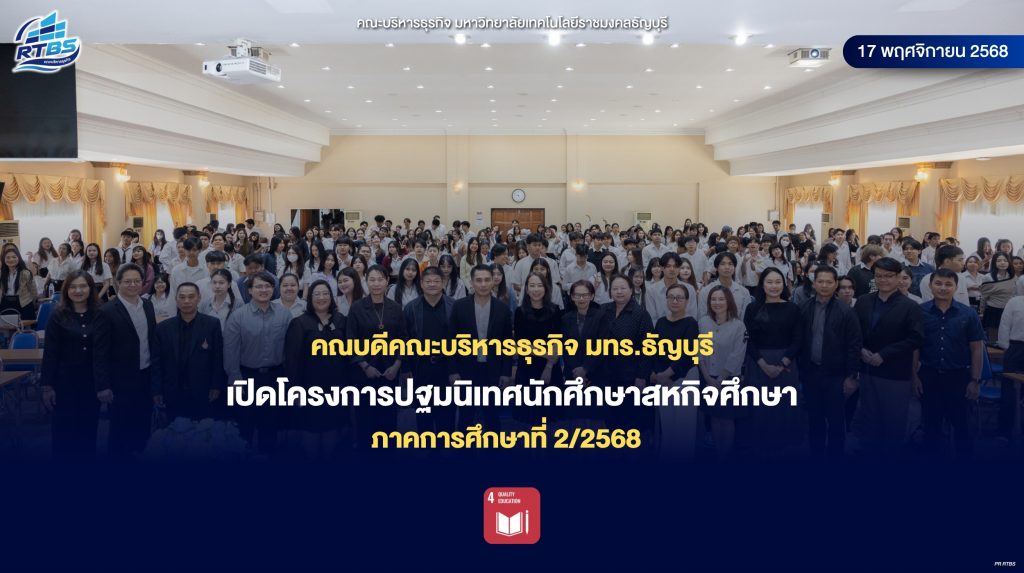 คณะบริหารธุรกิจ มหาวิทยาลัยเทคโนโลยีราชมงคลธัญบุรี จัดกิจกรรมอบรมเชิงปฏิบัติการในโครงการ สหกิจศึกษา ณ ห้อง BA4901 อาคาร 4 ชั้น 9 เพื่อเตรียมความพร้อมให้นักศึกษาเข้าสู่โลกการทำงานยุคดิจิทัล โดยมี คุณพรสุดา เพชรธนะกุล เป็นวิทยากร ถ่ายทอดองค์ความรู้และประสบการณ์ในหัวข้อ “การใช้เทคโนโลยีและนวัตกรรมในการทำงานในยุคดิจิทัล” กิจกรรมดังกล่าวจัดขึ้นตลอดทั้งวัน ระหว่างเวลา 09.00 – 16.00 น. เน้นรูปแบบ อบรมเชิงปฏิบัติการ (Workshop) ที่ให้นักศึกษาได้ฝึกทักษะจริง ทั้งด้านการใช้เครื่องมือดิจิทัล การคิดเชิงนวัตกรรม และการปรับตัวต่อการเปลี่ยนแปลงของโลกการทำงานในอนาคต อันสอดคล้องกับทิศทางการพัฒนาทรัพยากรมนุษย์ตามยุทธศาสตร์ชาติ และการยกระดับศักยภาพแรงงานไทยในเวทีสากล โดยเฉพาะในภาคธุรกิจที่ต้องการบุคลากรที่สามารถบูรณาการเทคโนโลยีและความคิดสร้างสรรค์เพื่อสร้างมูลค่าเพิ่ม ตลอดจนสนับสนุนเป้าหมายการพัฒนาที่ยั่งยืน (SDGs) ที่เกี่ยวข้องกับ การศึกษา การจ้างงานที่มีคุณค่า และนวัตกรรม ซึ่งสอดคล้องกับบทบาทของมหาวิทยาลัยในการเป็นแหล่งบ่มเพาะบัณฑิตนักปฏิบัติที่พร้อมสู่ตลาดแรงงาน