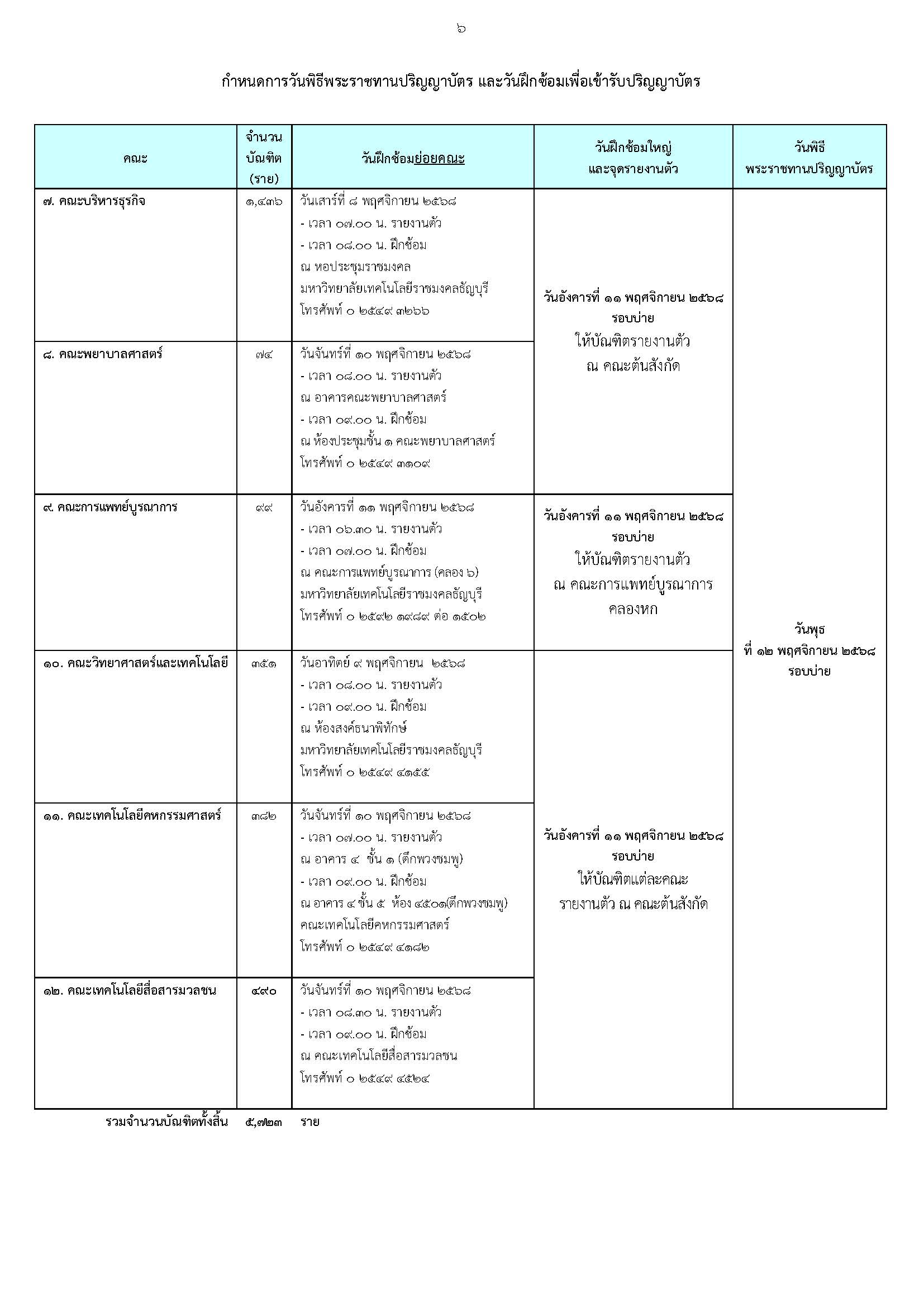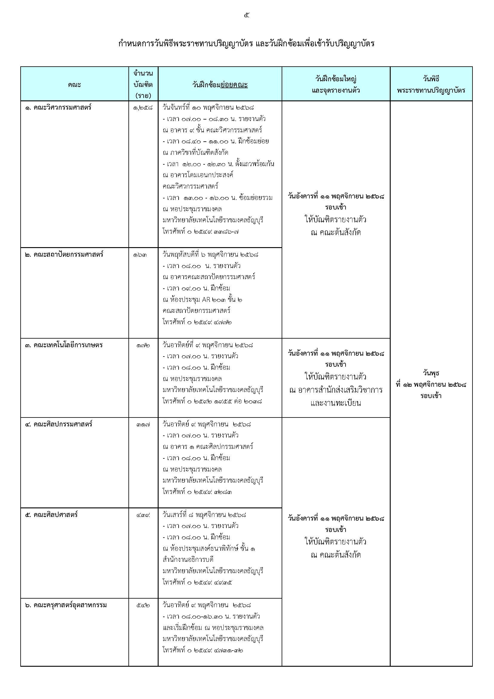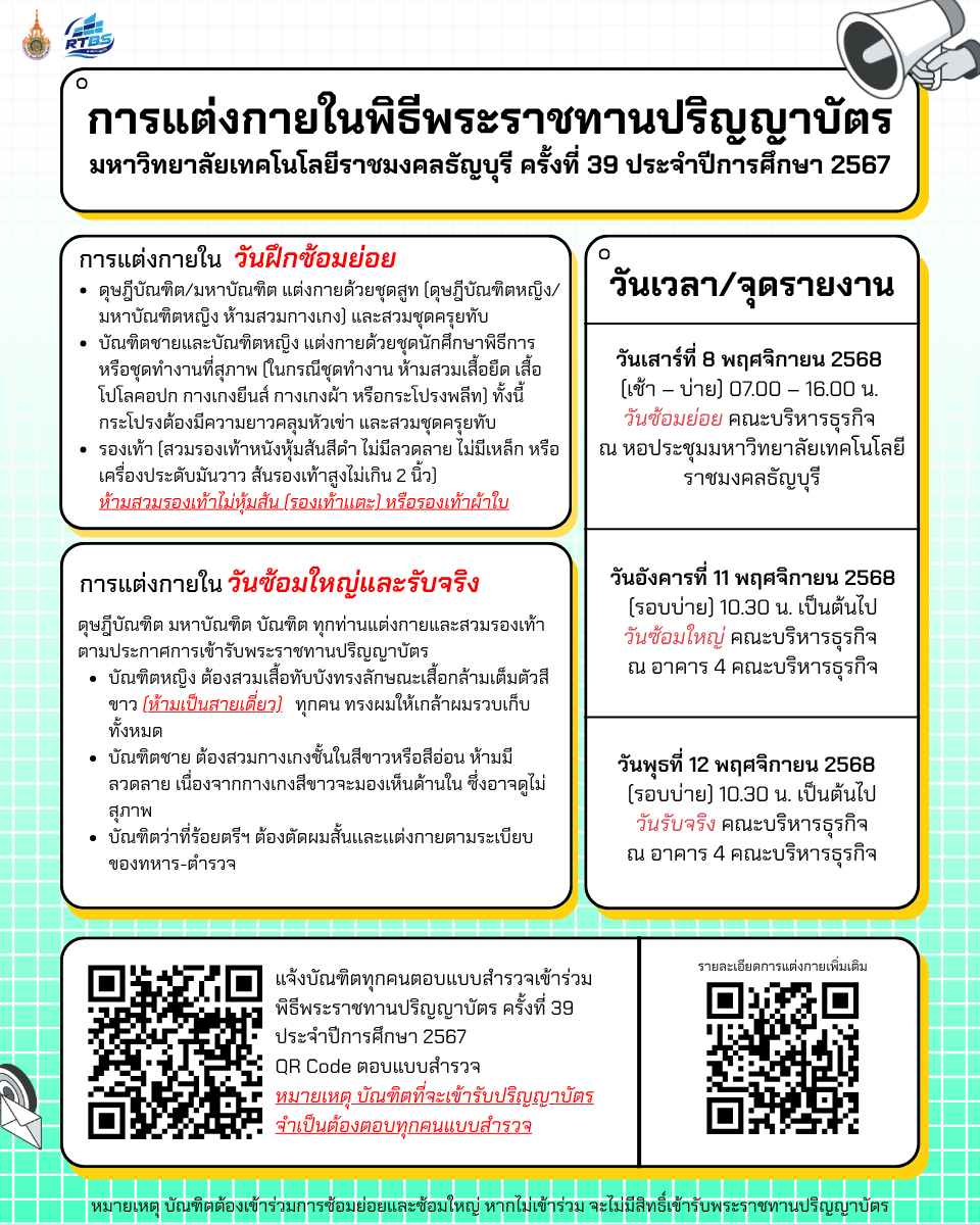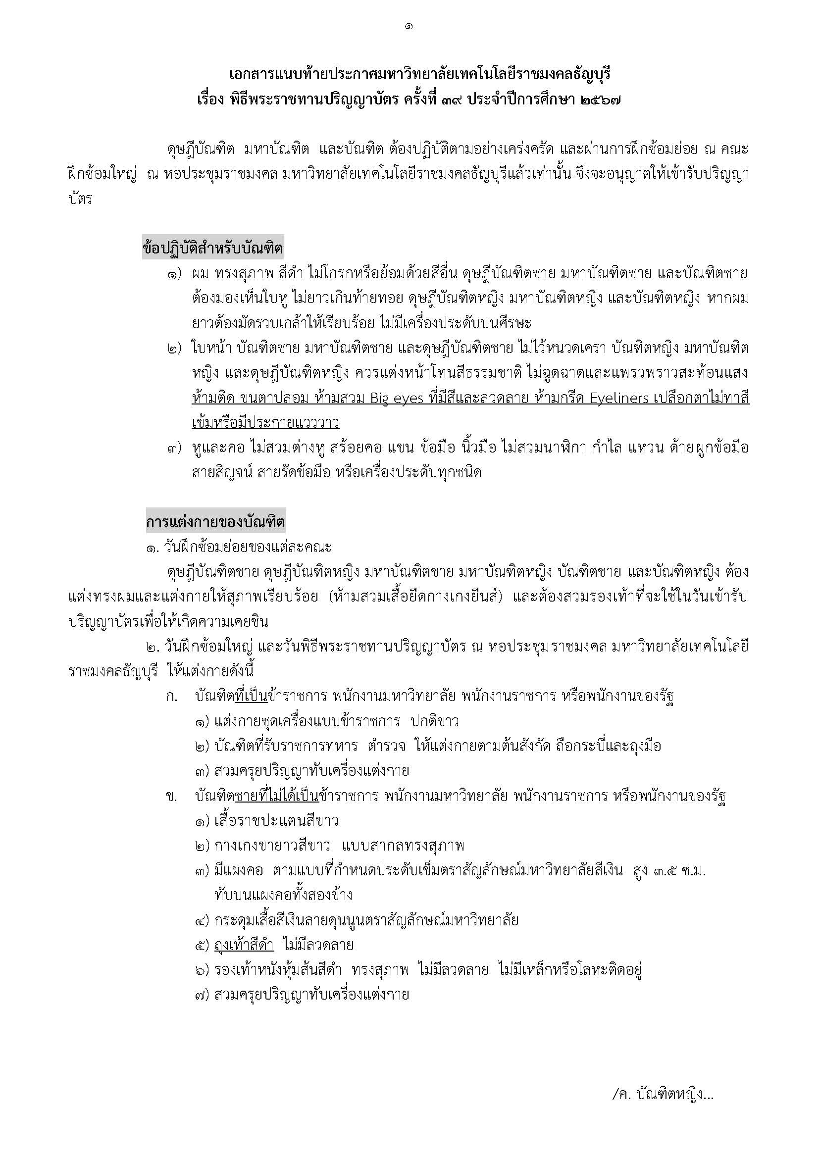 ๒.วันฝึกซ้อมใหญ่ และวันพิธีพระราชทานปริญญาบัตร ณ หอประชุมราชมงคล มหาวิทยาลัยเทคโนโลยีราชมงคลธัญบุรี ให้แต่งกายดังนี้