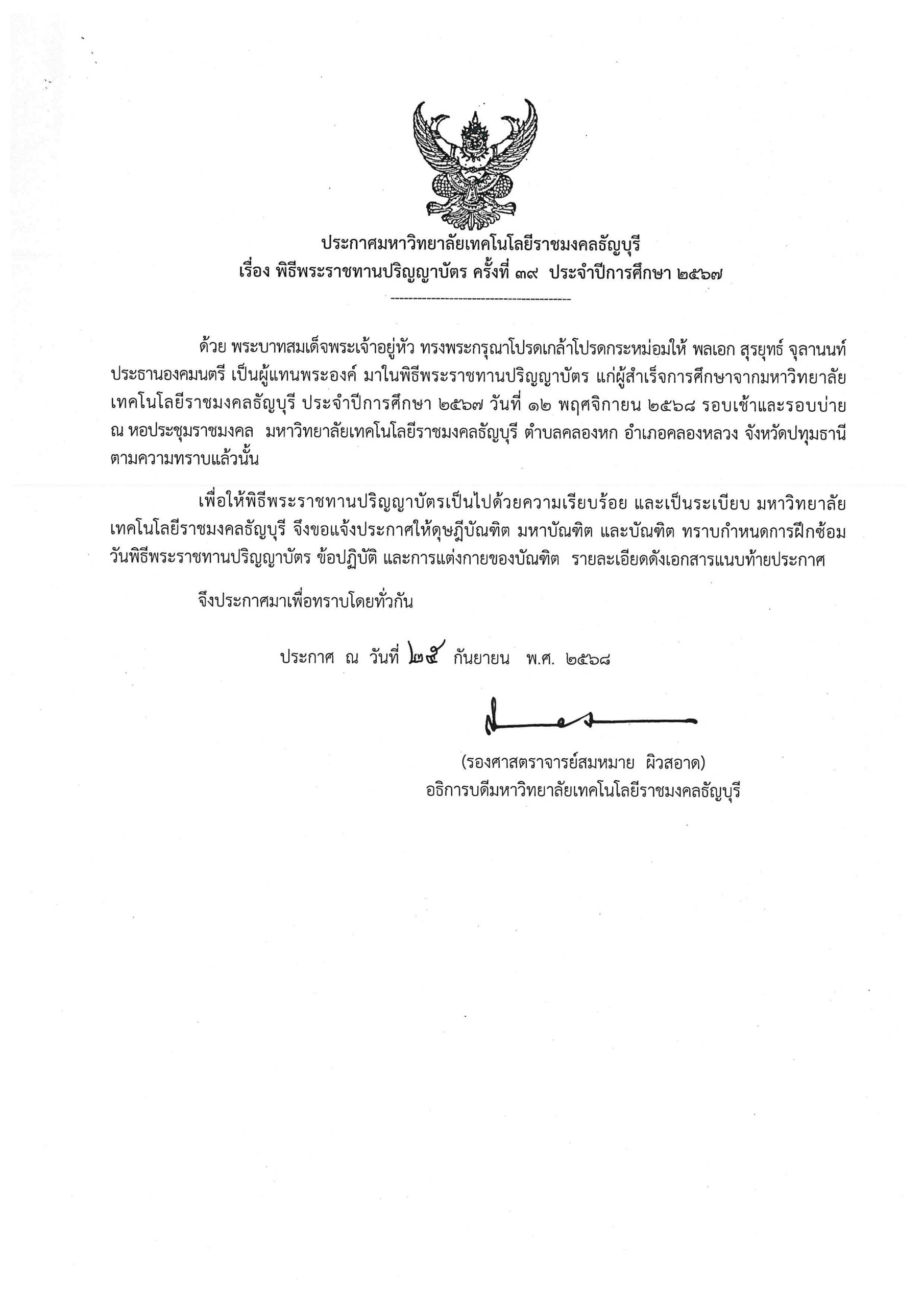 16 กันยายน 2025การแต่งการของดุษฎีบัณฑิต มหาบัณฑิต และบัณฑิต มหาวิทยาลัยเทคโนโลยีราชมงคลธัญบุรี