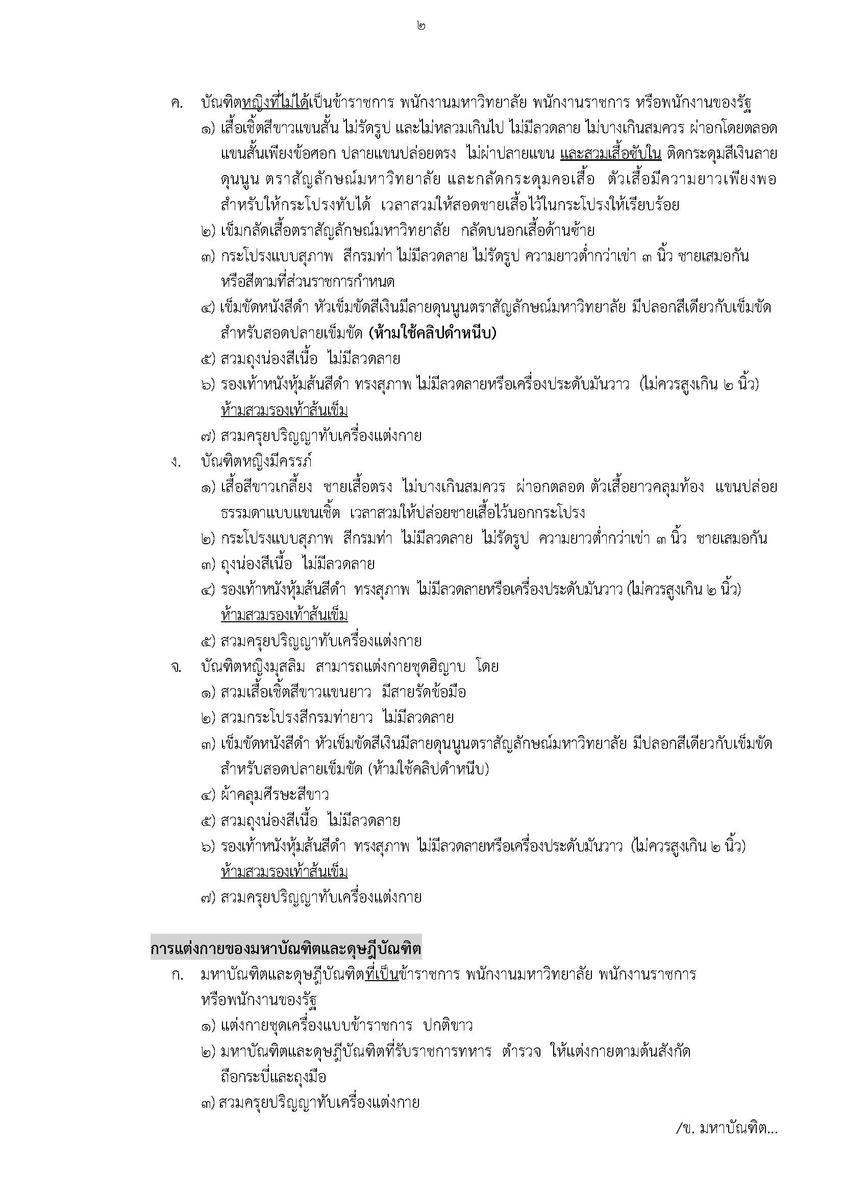 ๒) ใบหน้า บัณฑิตชาย มหาบัณฑิตชาย และดุษฎีบัณฑิตชาย ไม่ไว้หนวดเครา บัณฑิตหญิง มหาบัณฑิตหญิงและดุษฎีบัณฑิตหญิง ควรแต่งหน้าโทนสีธรรมชาติ ไม่ฉูดฉาดและแพรวพราวสะท้อนแสง ห้ามติดขนตาปลอม ห้ามสวม Big eyes ที่มีสีและลวดลาย ห้ามกรีด Eyeliners เปลือกตาไม่ทาสีเข้มหรือมีประกายแวววาว