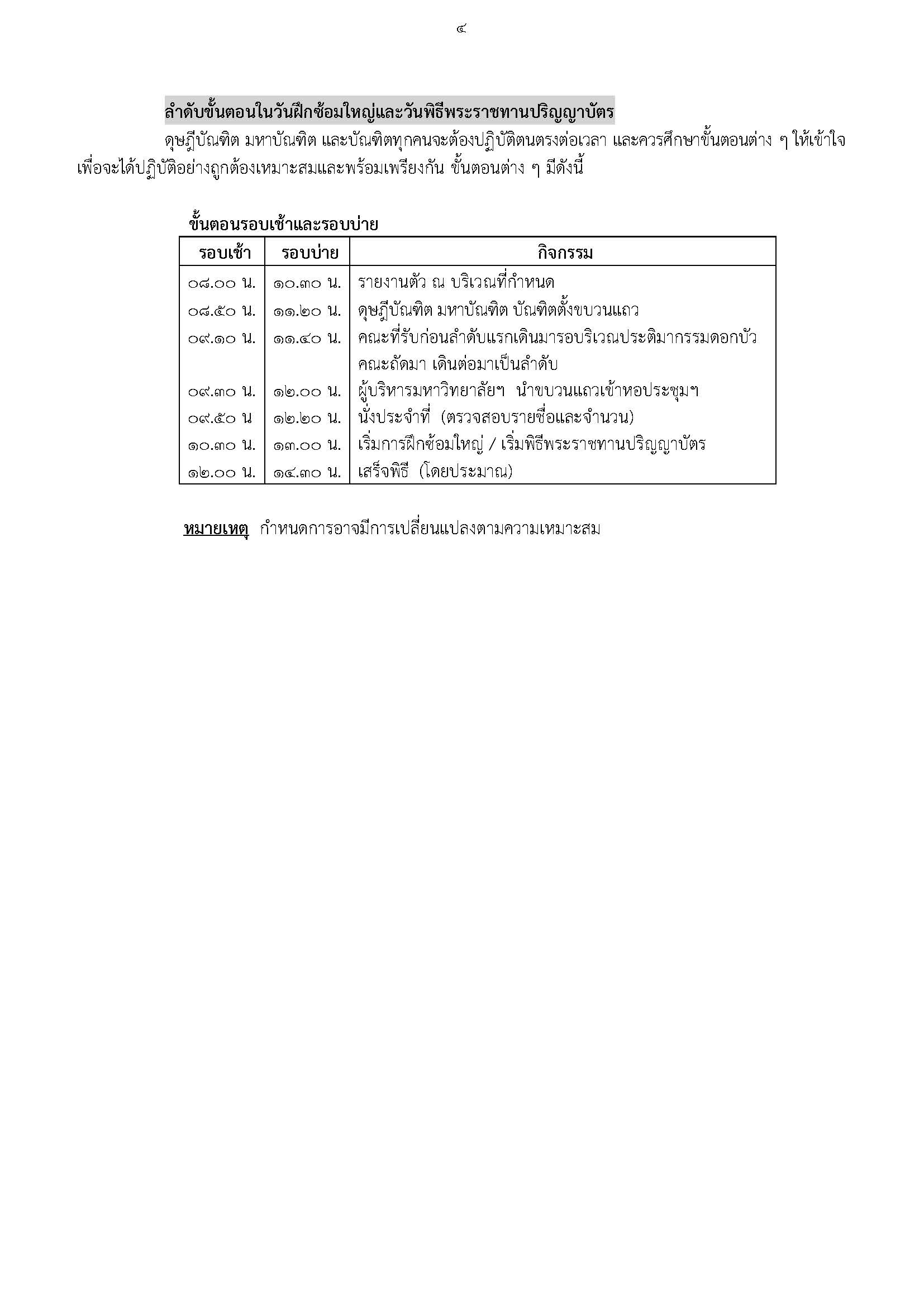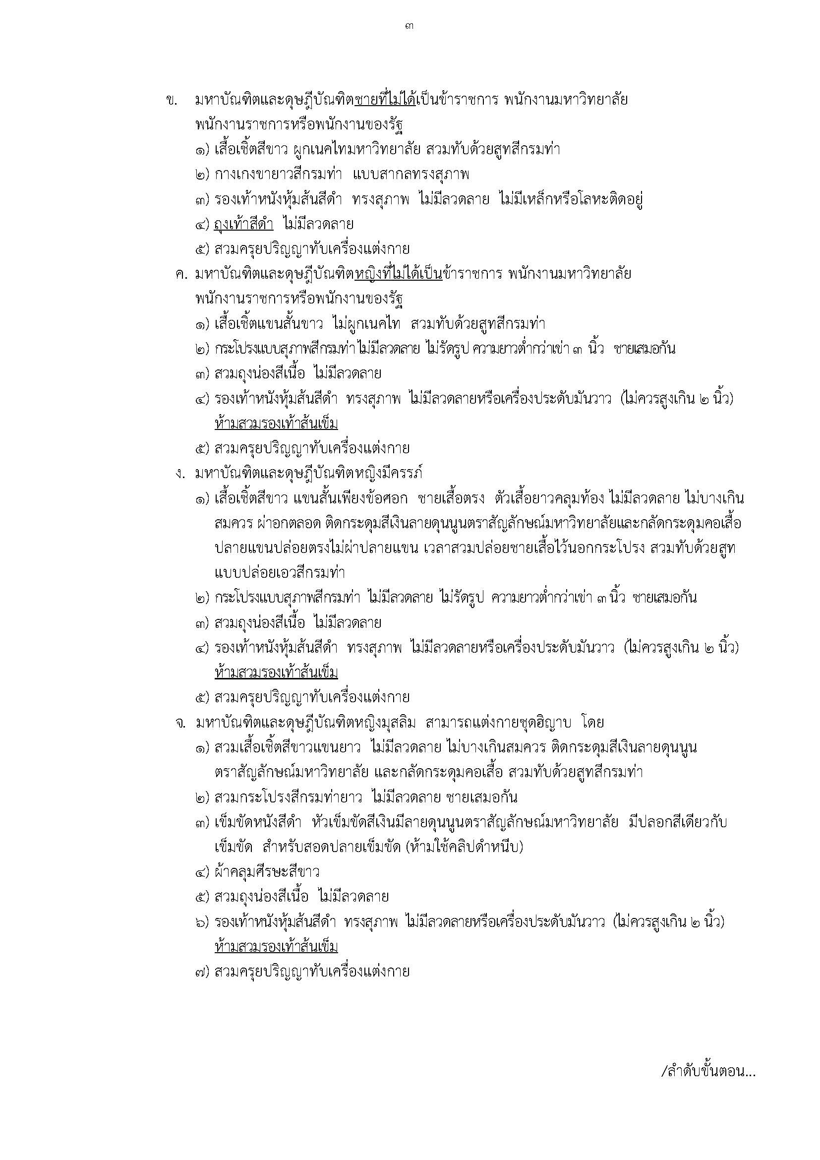 ดุษฎีบัณฑิตชาย ดุษฎีบัณฑิตหญิง มหาบัณฑิตชาย มหาบัณฑิตหญิง บัณฑิตชาย และบัณฑิตหญิง ต้องแต่งทรงผมและแต่งกายให้สุภาพเรียบร้อย (ห้ามสวมเสื้อยืดกางเกงยีนส์) และต้องสวมรองเท้าที่จะใช้ในวันเข้ารับ ปริญญาบัตรเพื่อให้เกิดความเคยชิน