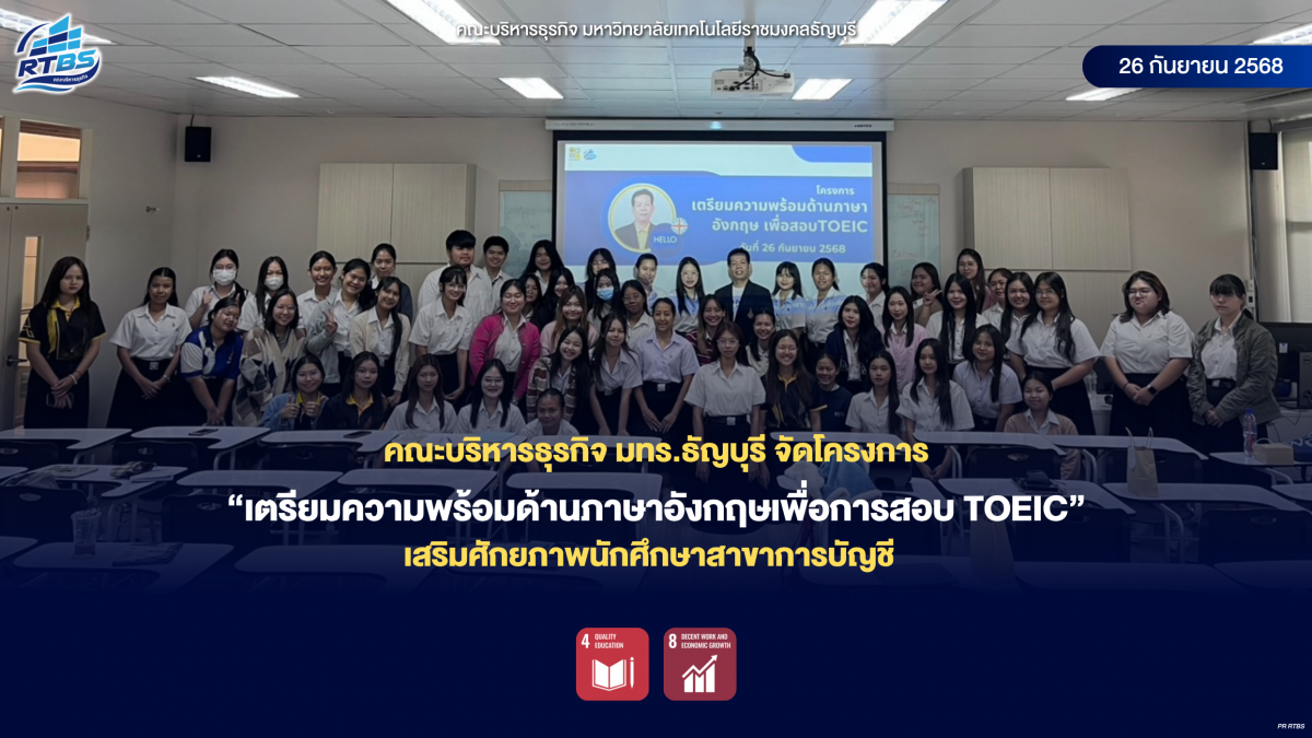 30 ตุลาคม 2025คณะบริหารธุรกิจ มทร.ธัญบุรี จัดโครงการ “เตรียมความพร้อมด้านภาษาอังกฤษเพื่อการสอบ TOEIC” เสริมศักยภาพนักศึกษาสาขาการบัญชี