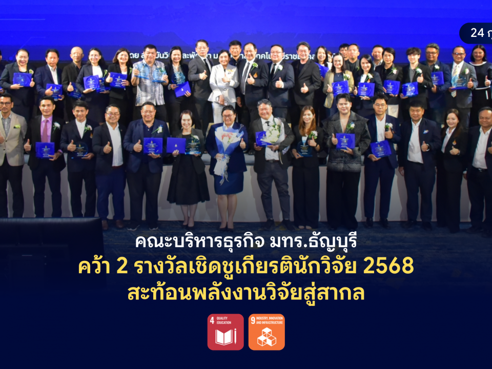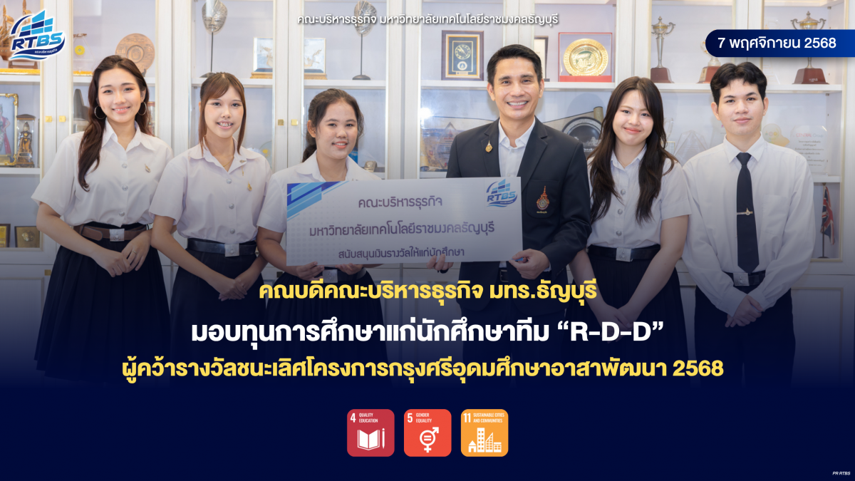 ศาสตราจารย์ ดร. กล้าหาญ ณ น่าน คณบดีคณะบริหารธุรกิจ มหาวิทยาลัยเทคโนโลยีราชมงคลธัญบุรี เป็นประธานในพิธีมอบทุนการศึกษาแก่นักศึกษาทีม “R-D-D ยิ่งแยก ยิ่งได้ ยิ่งพัฒนา” ซึ่งสร้างชื่อเสียงให้คณะโดยคว้ารางวัลชนะเลิศในโครงการ “กรุงศรีอุดมศึกษาอาสาพัฒนา 2568” ได้รับทุนสนับสนุนโครงการจำนวน 70,000 บาท เพื่อขยายผลและต่อยอดกิจกรรมเพื่อชุมชน