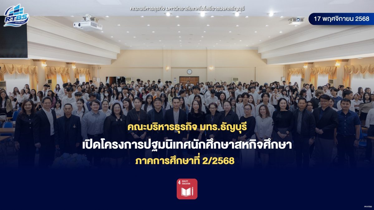 วันที่ 17 พฤศจิกายน 2568 คณะบริหารธุรกิจ มหาวิทยาลัยเทคโนโลยีราชมงคลธัญบุรี จัดโครงการปฐมนิเทศนักศึกษาสหกิจศึกษา ภาคการศึกษาที่ 2 ปีการศึกษา 2568 โดยมี ศาสตราจารย์ ดร. กล้าหาญ ณ น่าน คณบดีคณะบริหารธุรกิจ เป็นประธานเปิดงาน เพื่อเตรียมความพร้อมให้นักศึกษาจากสาขาวิชาการจัดการ และสาขาการเงินและเศรษฐศาสตร์ ก่อนเข้าสู่กระบวนการสหกิจศึกษาในสถานประกอบการจริง ซึ่งกิจกรรมจัดขึ้น ณ ห้องประชุมวชิระนาวา ชั้น 9 อาคาร 4 มุ่งเน้นการสร้างความเข้าใจในบทบาท หน้าที่ และจรรยาบรรณวิชาชีพ ตลอดจนเสริมทักษะที่จำเป็นต่อการทำงานในยุคเศรษฐกิจดิจิทัล