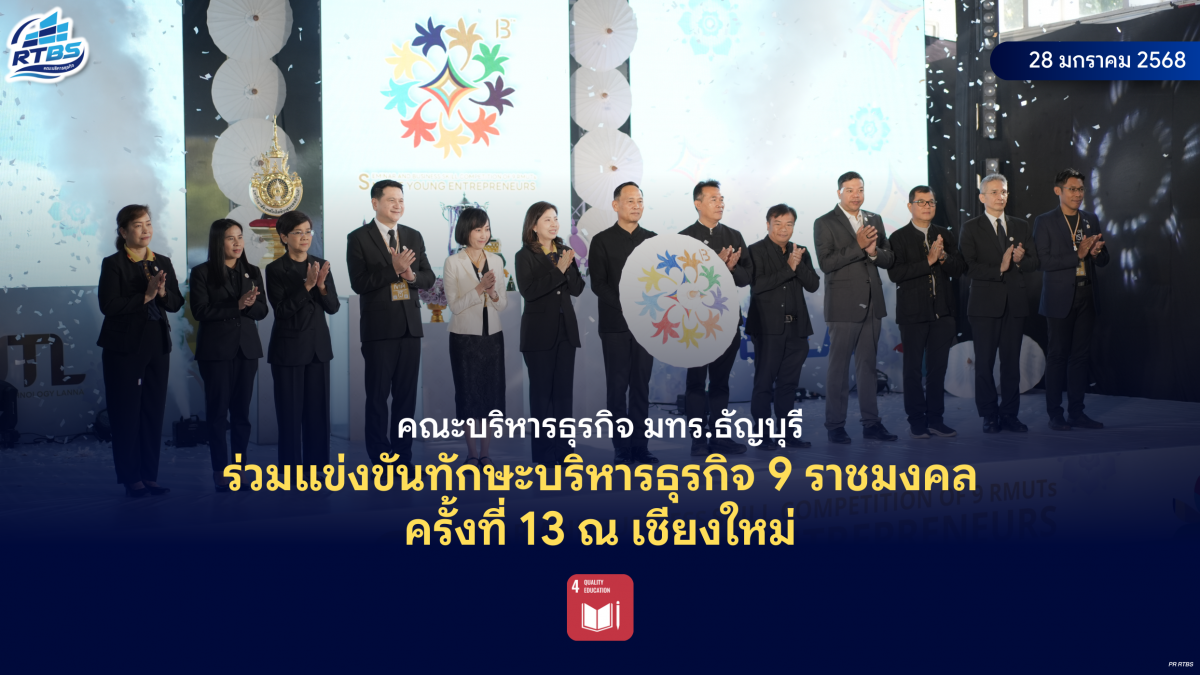 คณบดีคณะบริหารธุรกิจ มหาวิทยาลัยเทคโนโลยีราชมงคลธัญบุรี เข้าร่วมโครงการสัมมนาและแข่งขันทักษะทางวิชาการด้านบริหารธุรกิจ 9 ราชมงคล ครั้งที่ 13 ชิงถ้วยพระราชทาน สมเด็จพระกนิษฐาธิราชเจ้า กรมสมเด็จพระเทพรัตนราชสุดาฯ สยามบรมราชกุมารี ซึ่งจัดขึ้นระหว่างวันที่ 28–30 มกราคม 2569 ณ คณะบริหารธุรกิจและศิลปศาสตร์ มหาวิทยาลัยเทคโนโลยีราชมงคลล้านนา จังหวัดเชียงใหม่ โดยมีการนำนักศึกษาและอาจารย์เข้าร่วมแข่งขันในกิจกรรมทางวิชาการรวม 9 กิจกรรม เพื่อเสริมสร้างศักยภาพด้านบริหารธุรกิจและแลกเปลี่ยนองค์ความรู้ในระดับเครือข่าย