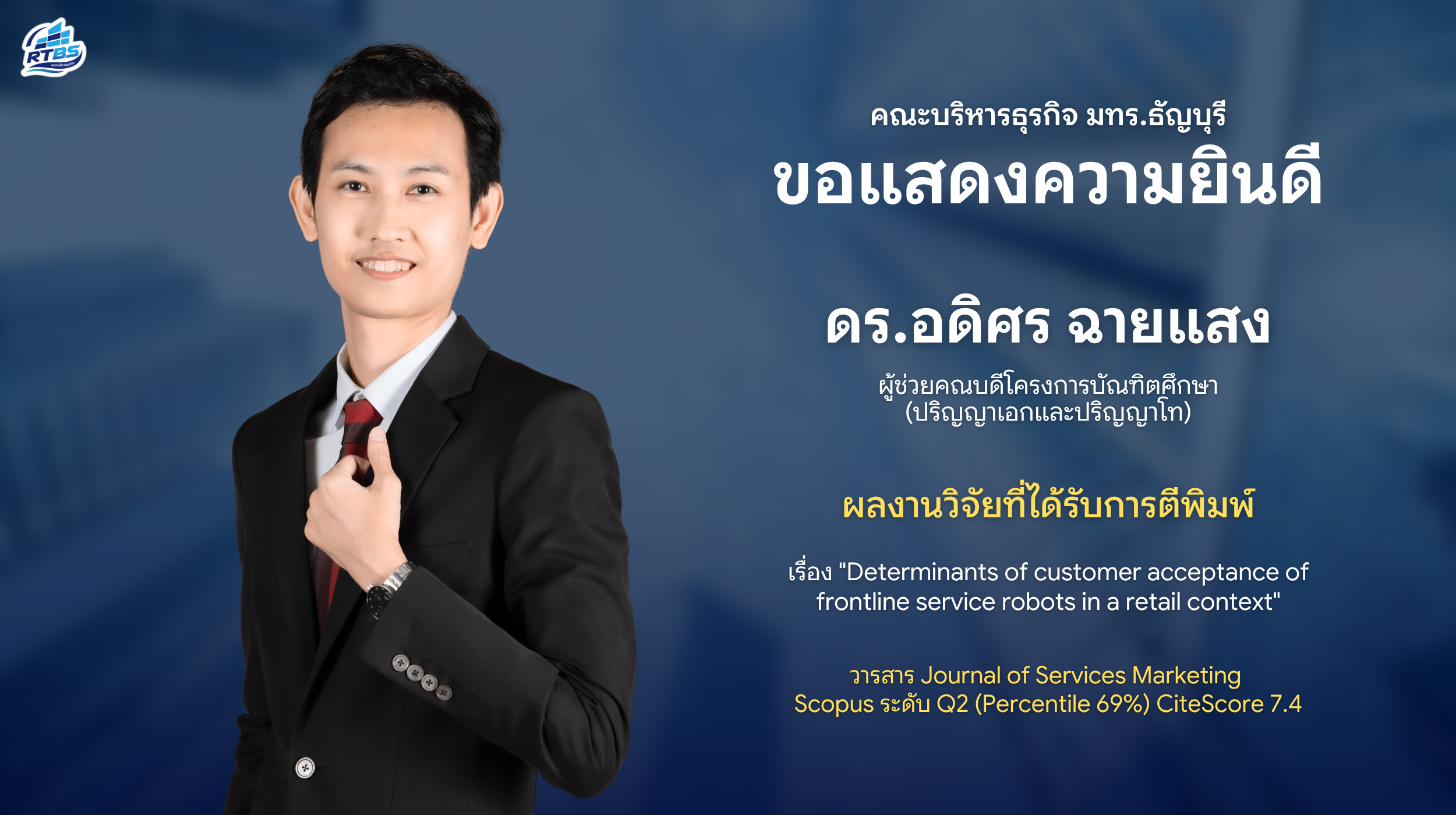 2 เมษายน 2569 – คณะบริหารธุรกิจ มหาวิทยาลัยเทคโนโลยีราชมงคลธัญบุรี ขอแสดงความยินดีกับ ดร.อดิศร ฉายแสง ในโอกาสที่ผลงานวิจัยเรื่อง "Determinants of customer acceptance of frontline service robots in a retail context" ได้รับการตีพิมพ์ในวารสาร Journal of Services Marketing ซึ่งจัดอยู่ในฐานข้อมูล Scopus ระดับ Q2 (Percentile 69%) โดยมีค่า CiteScore 7.4 ถือเป็นความสำเร็จที่สะท้อนศักยภาพด้านการวิจัยของบุคลากรคณะบริหารธุรกิจบนเวทีวิชาการระดับนานาชาติ